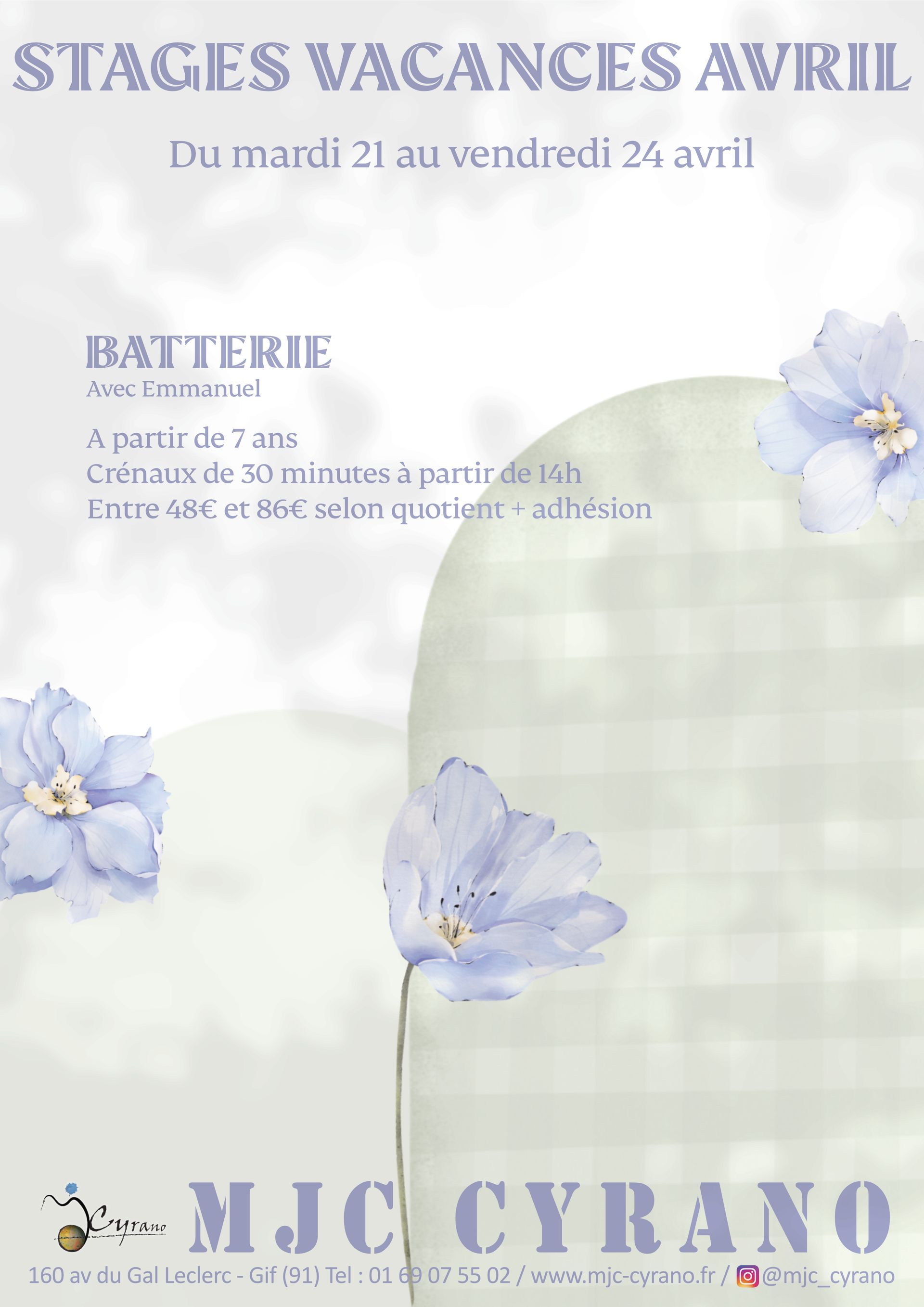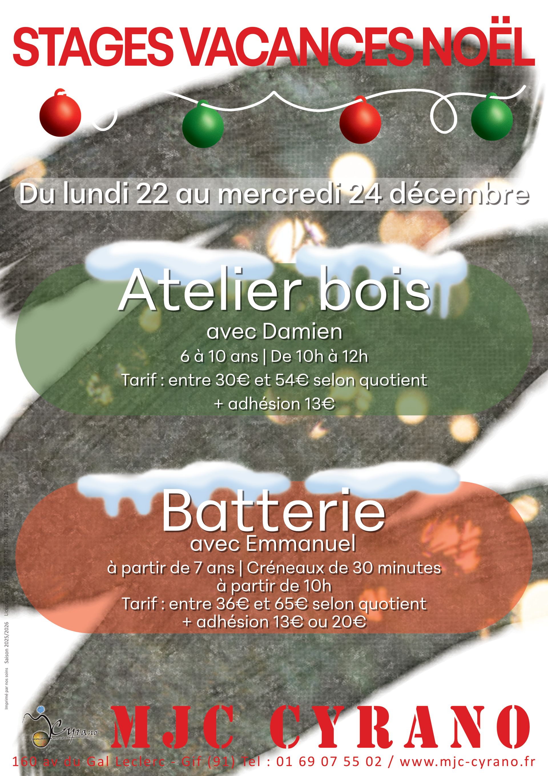 Pendant les vacances scolaires la MJC Cyrano propose des stages d’une semaine encadrés par des animateurs d’activité. Ces moments privilégiés permettent aux enfants et adolescents de partir à la découverte d’un atelier ou de se perfectionner à une pratique culturelle.