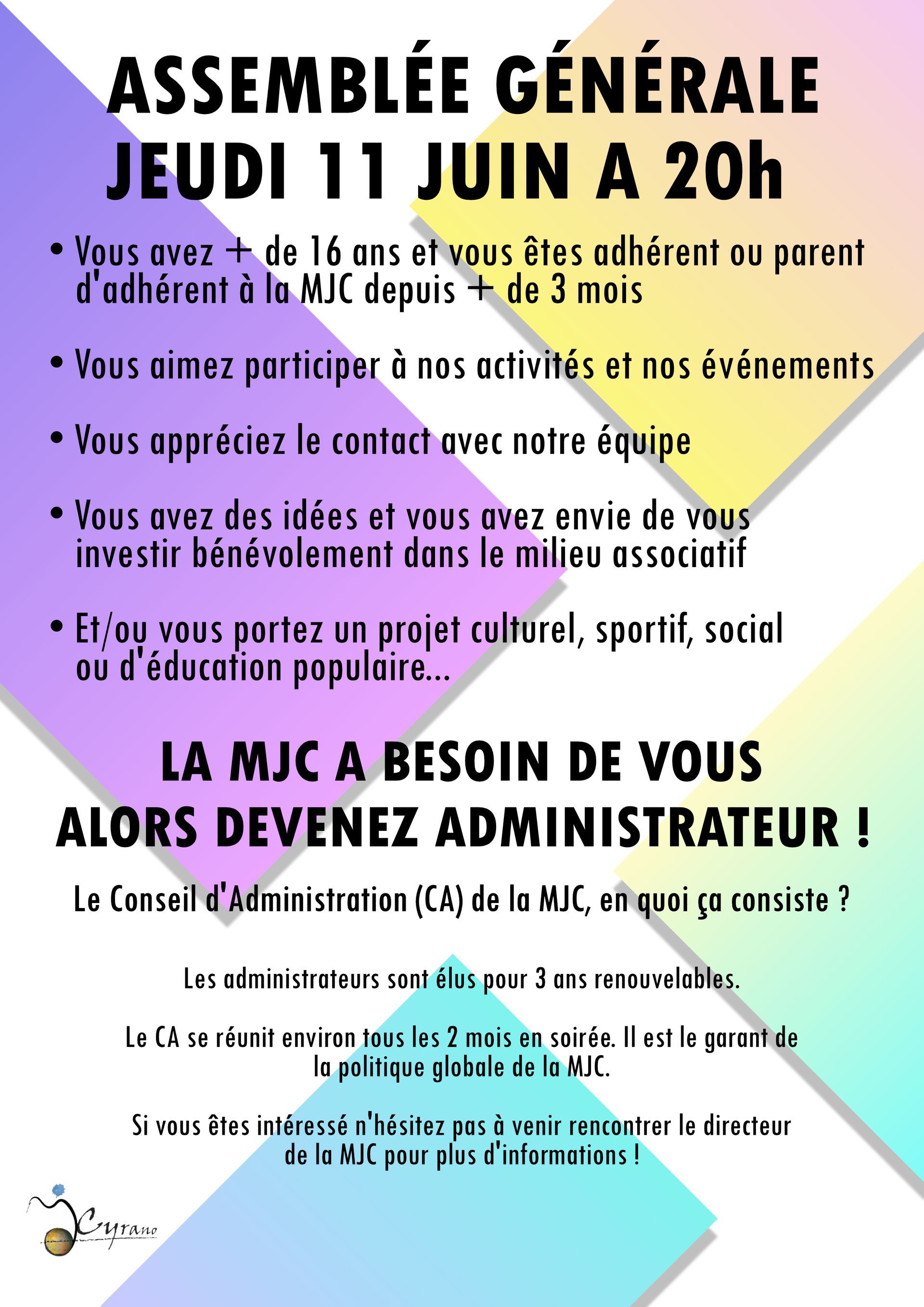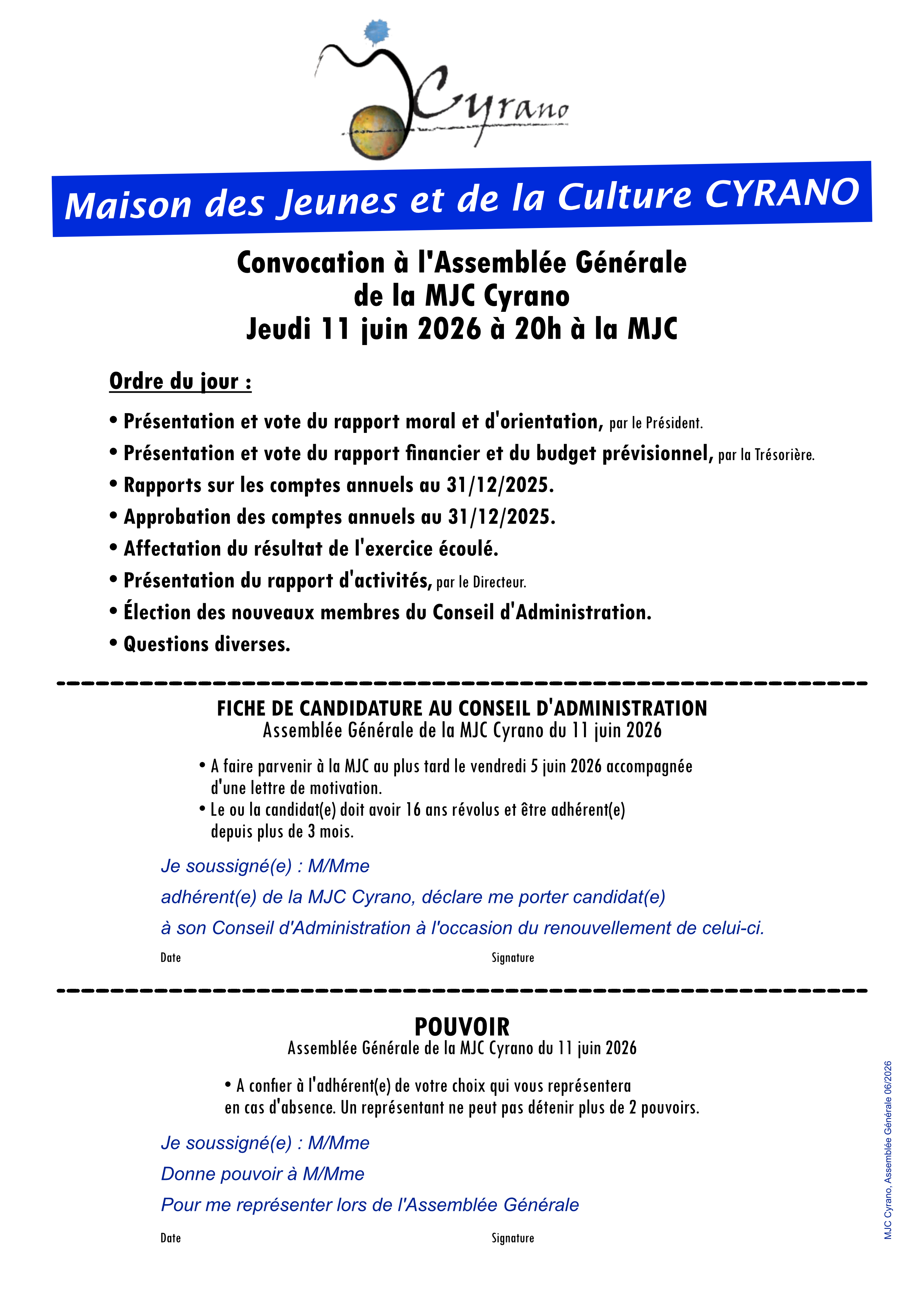 Pour télécharger la convocation à l'Assemblée Générale de la MJC Cyrano jeudi 11 juin 2026 cliquez ici