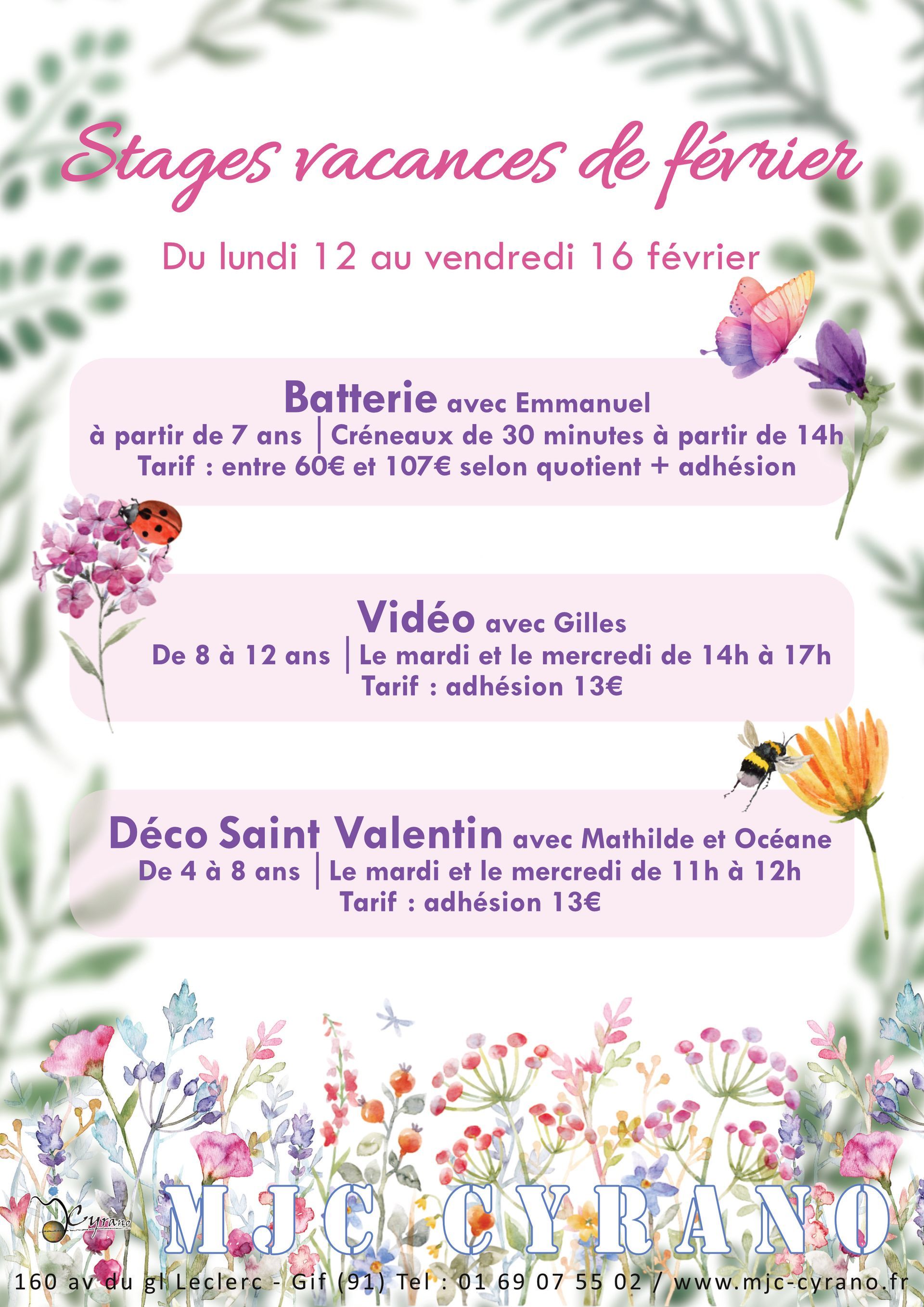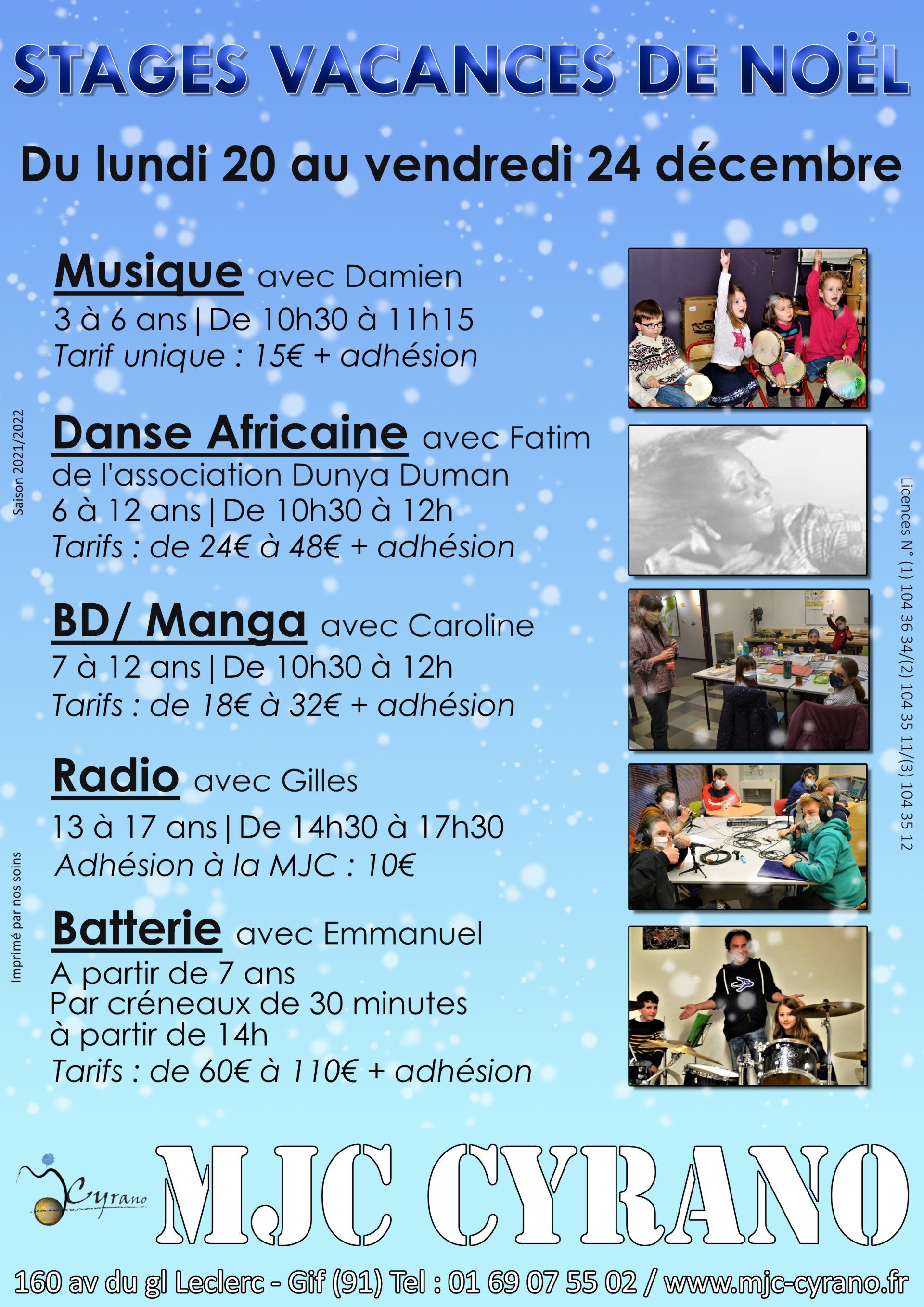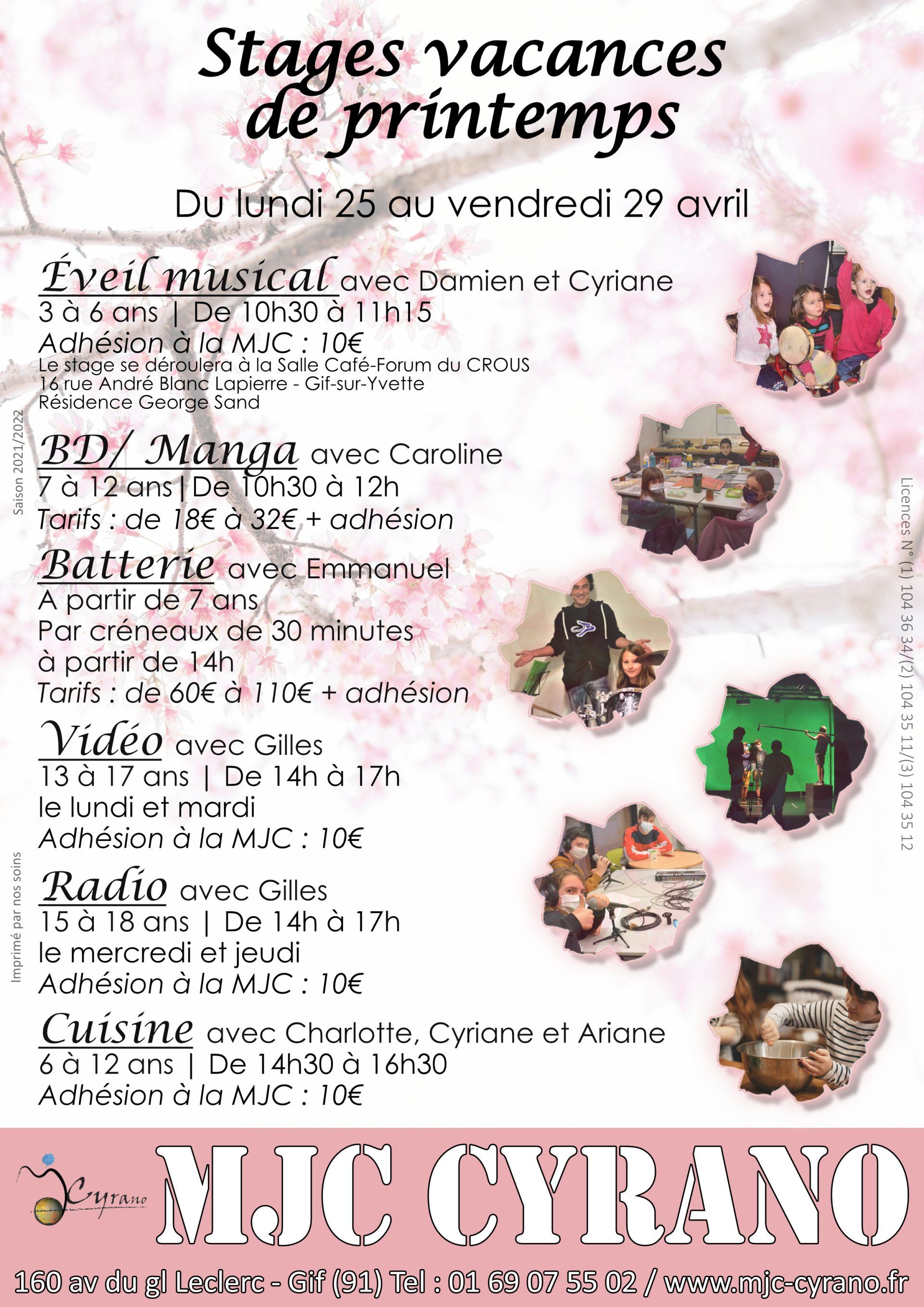 Pendant les vacances scolaires la MJC Cyrano propose des stages d’une semaine encadrés par des animateurs d’activité. Ces moments privilégiés permettent aux enfants et adolescents de partir à la découverte d’un atelier ou de se perfectionner à une pratique culturelle.