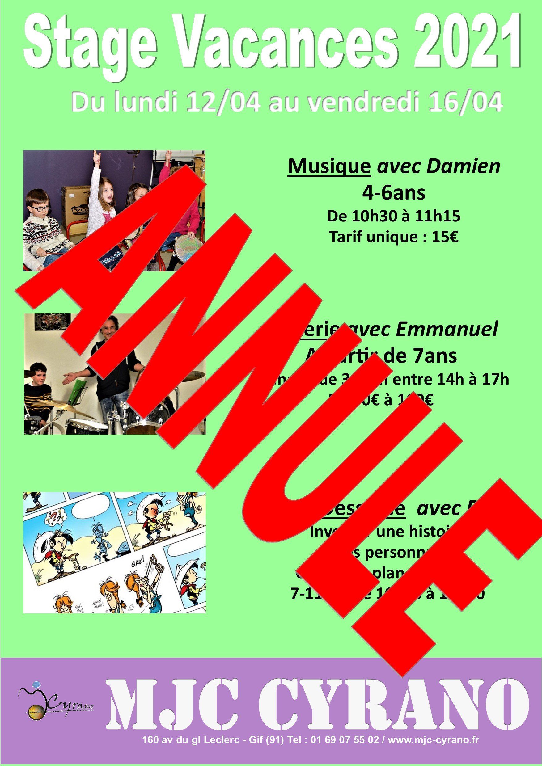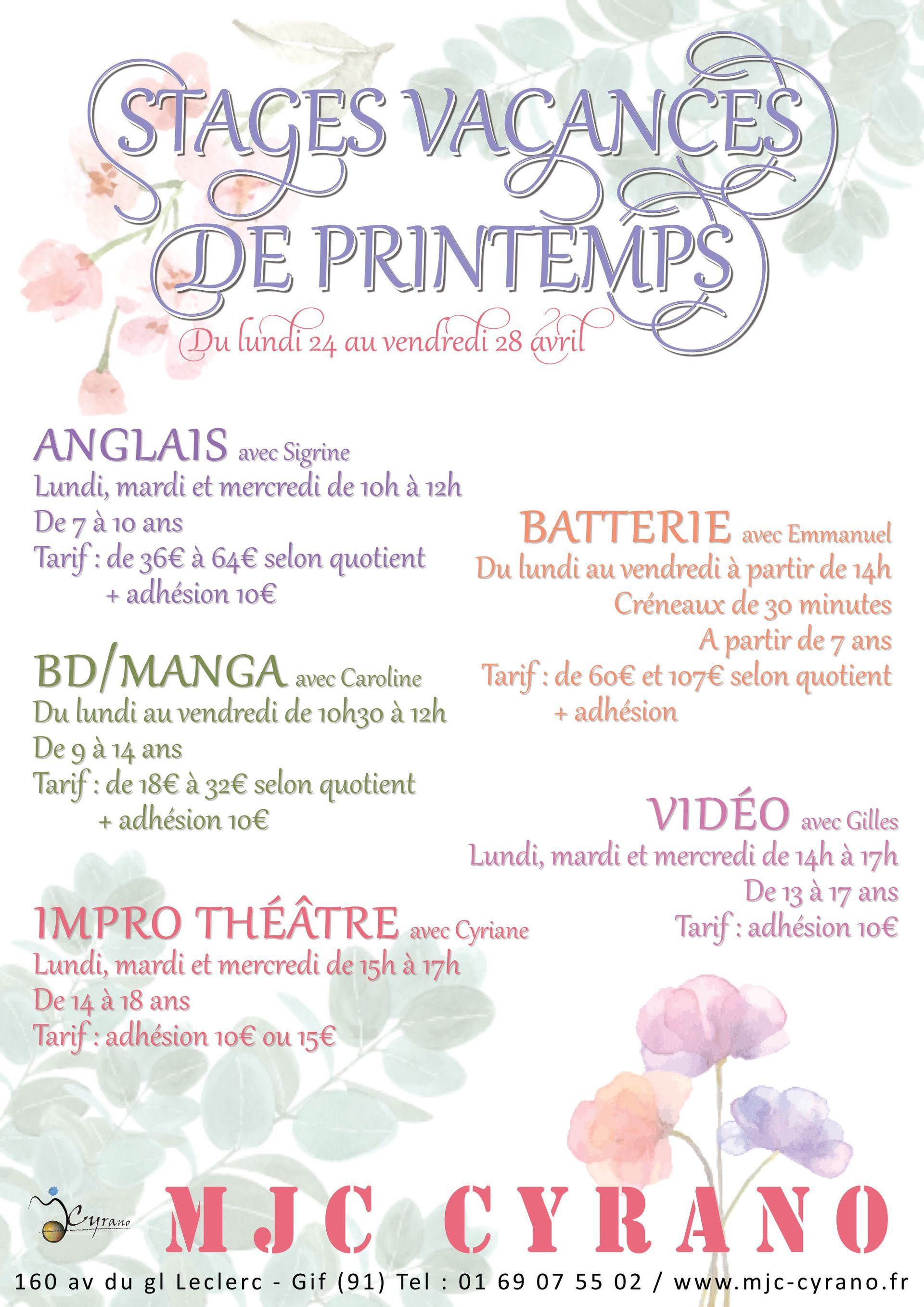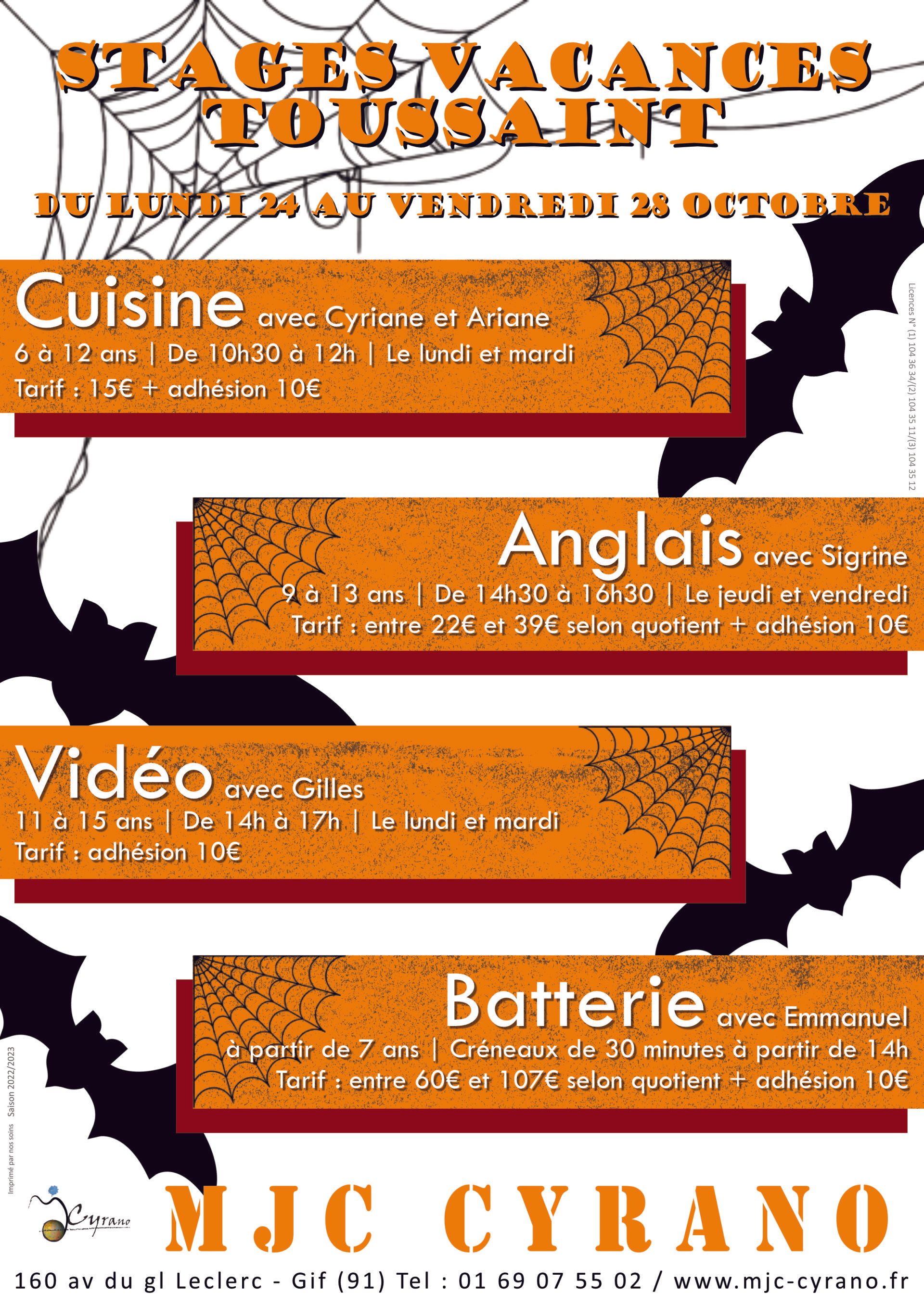 Pendant les vacances scolaires la MJC Cyrano propose des stages d’une semaine encadrés par des animateurs d’activité. Ces moments privilégiés permettent aux enfants et adolescents de partir à la découverte d’un atelier ou de se perfectionner à une pratique culturelle.